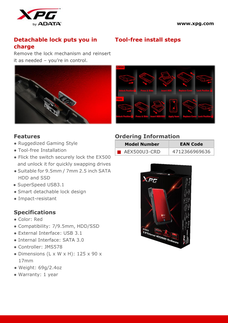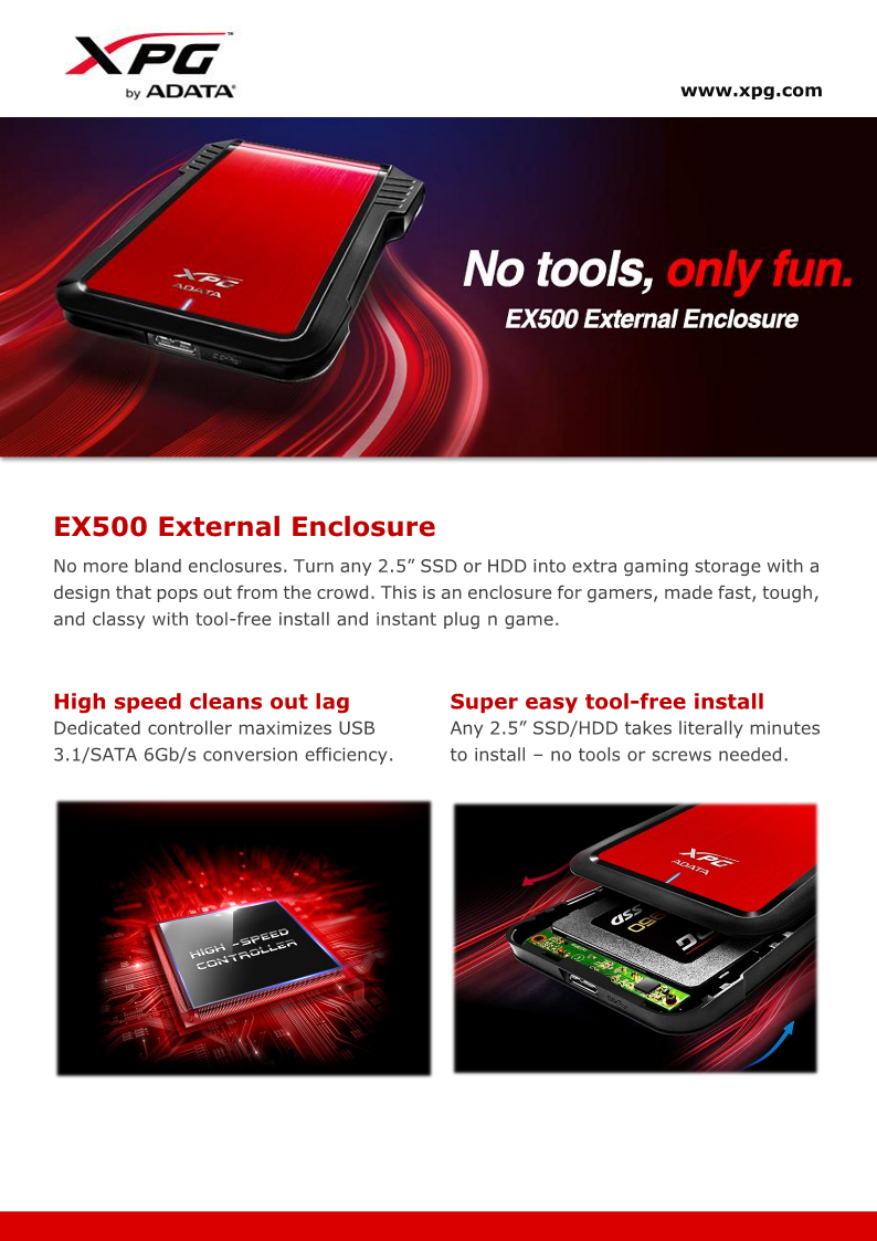 El Gabinete Externo ADATA EX500 es una solución práctica y eficiente para convertir un disco duro o unidad SSD de 2.5 pulgadas en un dispositivo de almacenamiento externo portátil. Su diseño compacto permite instalar fácilmente una unidad SATA y utilizarla como almacenamiento adicional para tu computadora o laptop.
